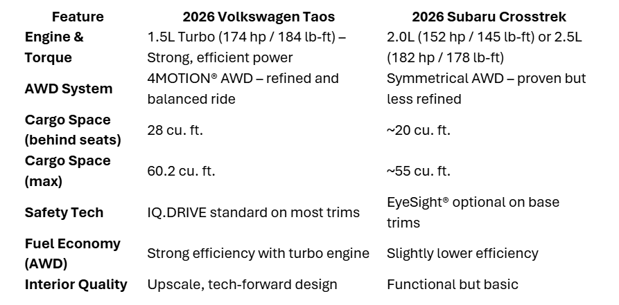 A: The 2026 Taos is expected to offer up to 28 cubic feet of cargo space behind the rear seats and over 60 cubic feet total—giving it an edge over the Subaru Crosstrek when it arrives at Volkswagen of Akron.